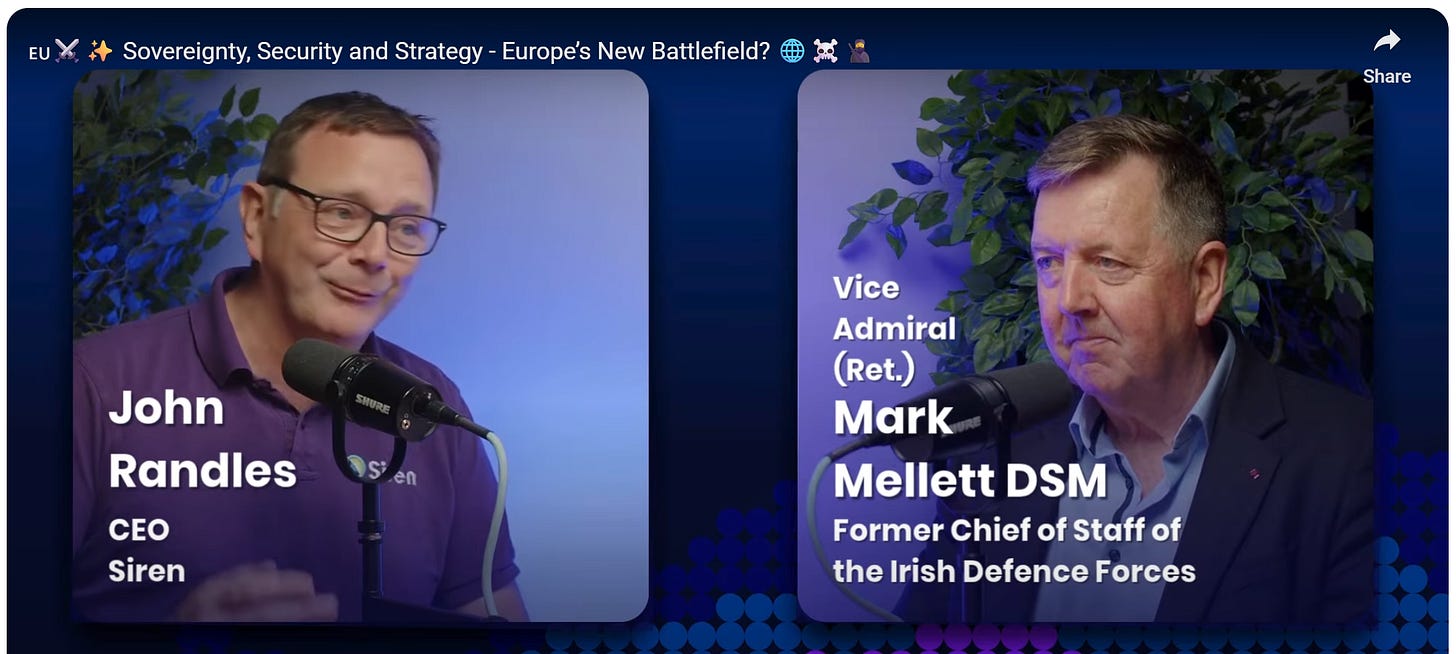 A successful energy transition depends on shared infrastructure — and that means shared security and responsibility. In a recent episode of the Siren Investigates podcast, John Randles speaks with Vice Admiral (Rtd) Mark Mellett, former Chief of Staff of Ireland’s Defence Forces, about how Europe must rethink sovereignty, security, and resilience in an era of hybrid threats. Mellett argues that sovereignty is like property: “you only own it if you can defend it” warning that peace-time complacency has left many nations exposed. Their discussion ranges from cyberattacks and disinformation to AI, innovation, and the need for European strategic autonomy that blends defence, diplomacy, and decarbonisation. Ireland’s maritime domain, he notes, is both a vulnerability and an opportunity — a frontier where energy, data, and food security intersect. It’s a powerful reminder that collective security isn’t just about armies and alliances, but about how we protect the systems and values that power our shared future.